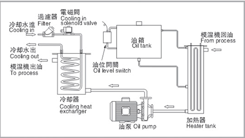 以上參數若有變更,恕不另行通知 The specification is suject to change without prior notification 可根據客戶要求,訂做各種非標模具溫控機,如高溫模溫機,負壓模溫機,精密模溫機 工作原理圖 Schematic diagram